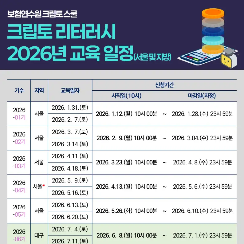2026년 3월 7일과 3월 14일, 이틀에 걸쳐 서울교육대학에서 크립토 리터러시 2기가 개최되었습니다. 1일차는 사향융합체육관 1층 그랜드홀, 2일차는 연구강의동 사향문화관에서 진행되었습니다.
